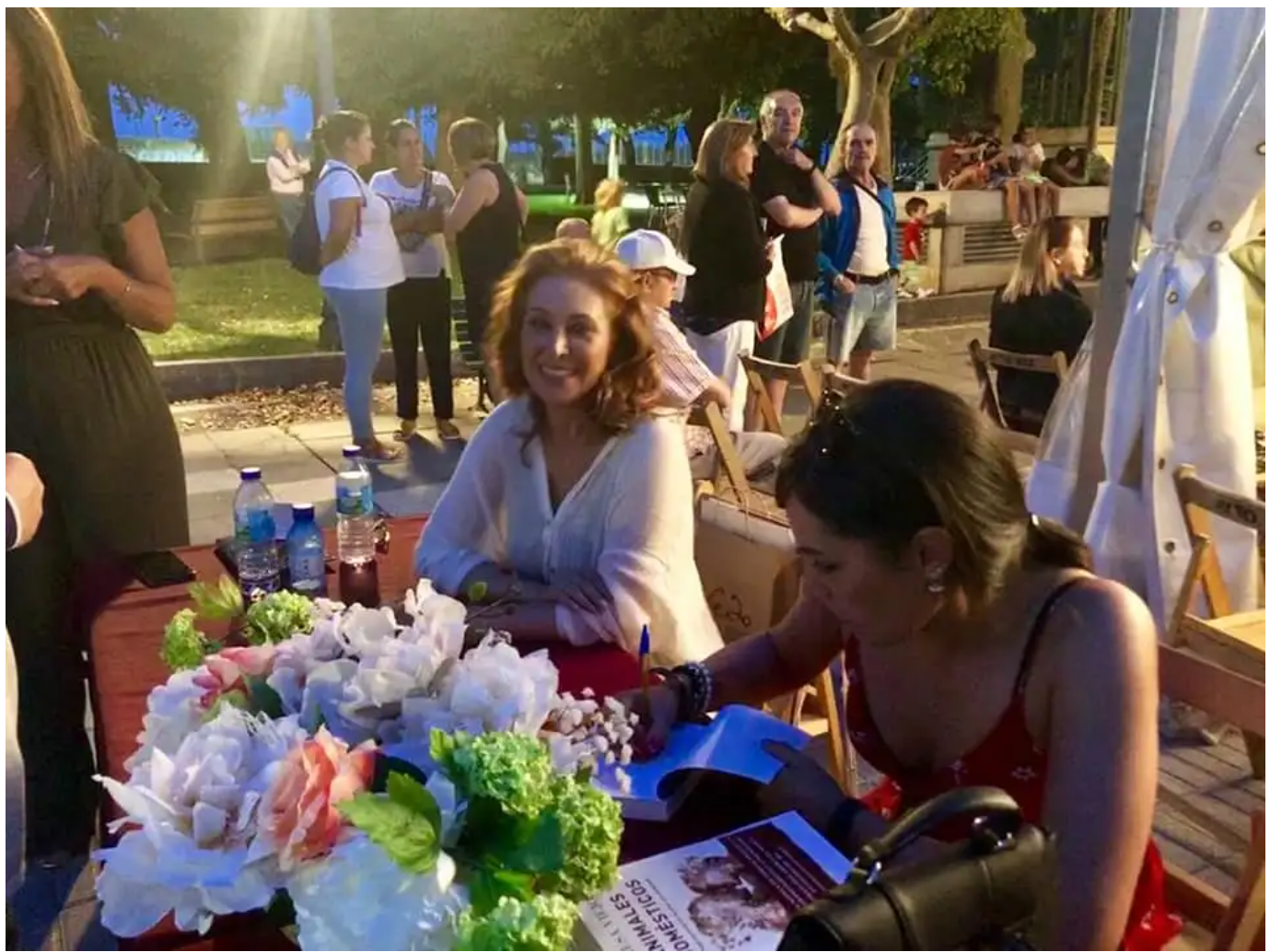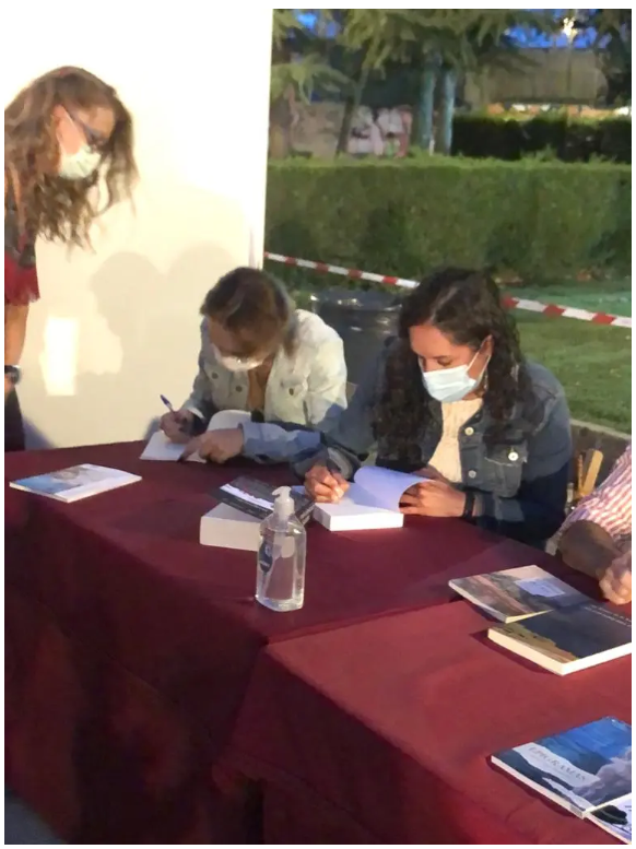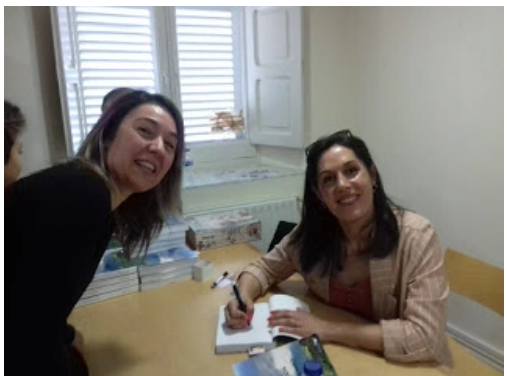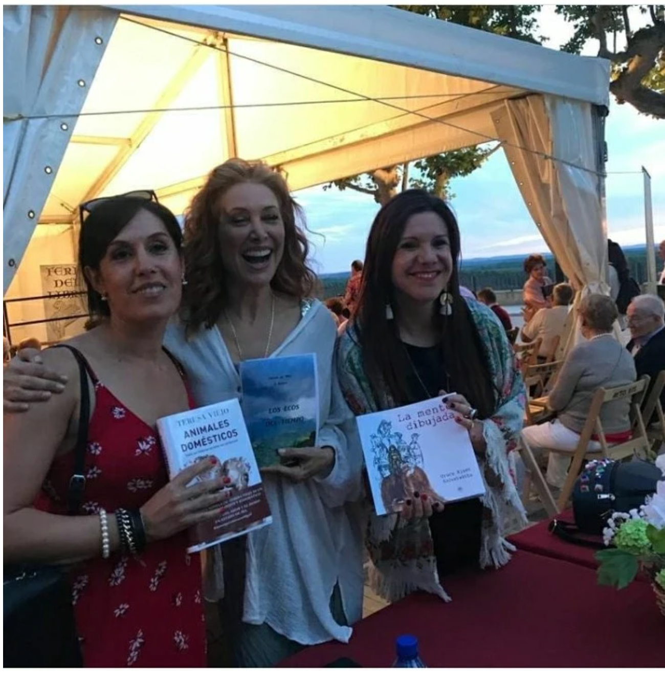 Firma de libros junto a Teresa Viejo y Grace Klimt (Ruth Rozados), otras autoras que compartieron conmigo tarde de feria.